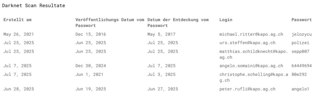 Beispiel von im Darknet öffentlichen Kennwörtern. Die dort genannten sind nicht mehr aktiv, darum dürfen wir diese zeigen. Sie erhalten bei neuen Darknet Daten automatisch ein Mail mit der Warnung und den Informationen von uns