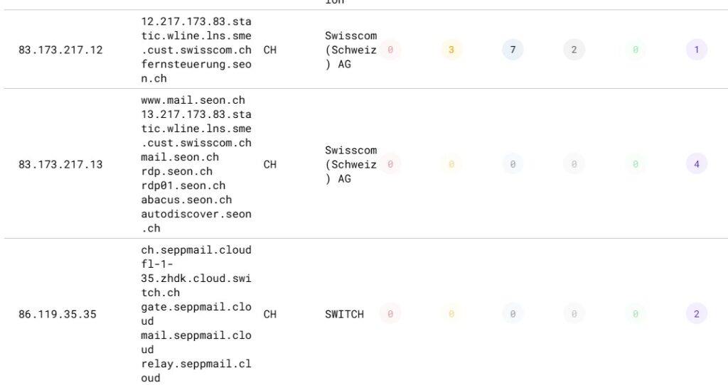 die automatisch erkannten IP und DNS Einträge und daraus resultierenden offenen Ports sowie CVEs